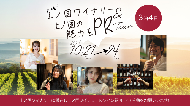 ワイン関係インフルエンサーの方、ワイン好きの方を対象に 上ノ国ワイナリーと上ノ国町の魅力をPRするツアーを開催 上ノ国ワイナリーに滞在し上ノ国ワイナリーのワイン紹介、 醸造体験をSNS等で発信しPR活動をお願いします。 上ノ国ワイナリーは北海道道南に位置する上ノ国町に初めてできた 廃校の小学校をリノベーションし宿泊できるワイナリーです。 そんなワイナリーに行ってワイナリーの魅力、上ノ国町の魅力をPRというのが今回のツアーです。 ■開催日 2026年10月21日(火)~24日(金) 3泊4日 ■宿泊場所 上ノ国ワイナリー ■参加条件 ・フォロワー数1000人以上 ・滞在中SNS等が発信できる方 ・東京発羽田空港、大阪発伊丹空港、名古屋発セントレア、札幌発JR札幌駅、丘珠空港の方 (20歳未満の方、参加不可) ■応募人数 5名(…